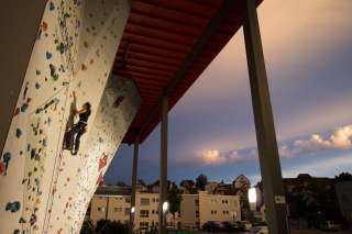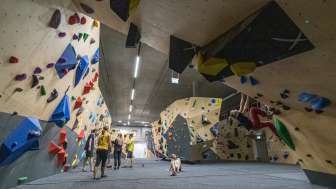 ce centre sportif unique en son genre propose plus de 200 voies d'escalade intérieures et extérieures, de niveau facile à très difficile, 5 terrains de badminton et une salle de bloc ultramoderne.