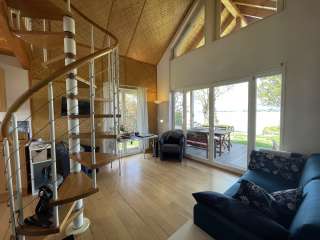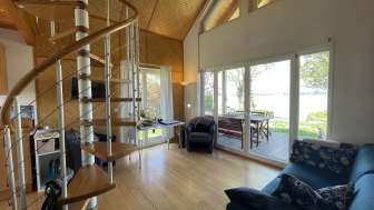 Une cuisine lumineuse est reliée au salon confortable avec un poêle suédois, un canapé-lit et une petite table. Les hôtes peuvent y contempler le lac pendant que le feu crépite dans le poêle.