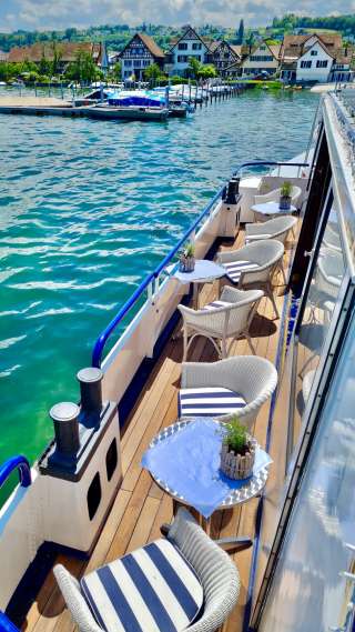 L'ancien bateau de croisière MS Kreuzlingen a déjà plus de 65 ans. Pourtant, il n'a pas été mis à la retraite - non, il a bénéficié d'une cure de rajeunissement. Rénové avec style et transformé en restaurant, il est amarré depuis 2021 sous le nom de "erMarina" à Ermatingen, dans le nouveau port Stedi d'Ermatingen. Une boisson fraîche à la main et doucement bercé, on se détend sur le salon du pont ou on déguste une cuisine régionale raffinée au restaurant. Et toujours avec une vue magnifique sur l'Untersee. Le bateau peut en outre être réservé tous les jours pour des manifestations et des excursions pouvant accueillir jusqu'à 180 personnes. D'octobre à mars, on peut déguster la meilleure fondue au fromage de la région dans le bateau d'hiver "SeeChalet".