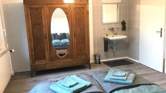 De plus, un petit balcon (fumeur) dans la cage d'escalier et la place assise devant le jardin sont réservés aux hôtes. Une place de parking et un emplacement pour les vélos sont à disposition.