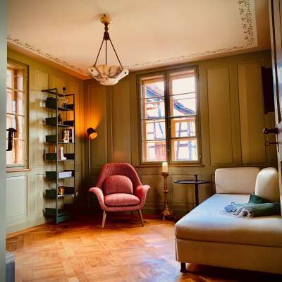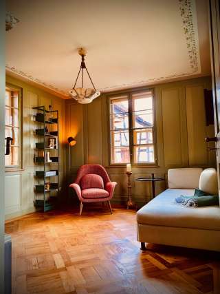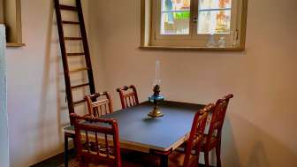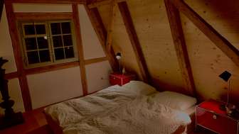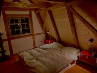 Le Häxehüsli dispose d'une surface habitable de près de 60 mètres carrés sur trois étages et peut accueillir deux personnes. La maison est entièrement aménagée avec de belles antiquités et des meubles neufs de qualité. Dans la cave voûtée historique, avec beaucoup de lumière du jour et une vue dégagée sur le jardin, se trouve la cuisine compacte et un poêle à bois. Dans la Häxehüslistube, les hôtes peuvent laisser leur regard vagabonder au loin à travers les fenêtres vieilles de 170 ans. En hiver, le magnifique poêle en faïence assure une chaleur agréable. À l'étage mansardé, une chambre à coucher confortable avec un coin bureau séparé a été aménagée sous la charpente apparente. Une douche spacieuse et un WC avec lavabo sont à disposition au sous-sol.