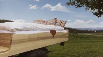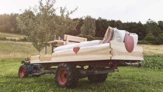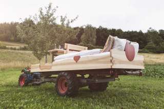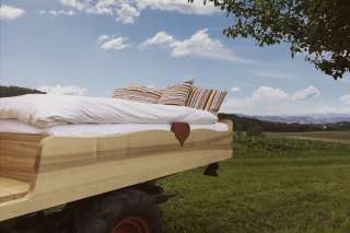 Autrefois un allègement bienvenu du travail dans l'agriculture, aujourd'hui une offre d'hébergement créative : le dernier lit à baldaquin de Thurgau Tourismus a été créé sur le chariot d'un Rapid Spezial.