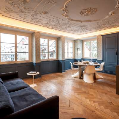 Au cœur de la petite ville baroque historique de Bischofszell, deux maisons abritent les cinq grands appartements de vacances Jacob 1808 pour deux à quatre personnes. Ils étaient la maison de marchands de tissus, de maîtres selliers, d'aubergistes et même de conseillers municipaux de Bischofszell. Cet héritage historique, et donc l'âme des maisons, a été préservé lors de la transformation minutieuse effectuée avec l'aide de l'Office de la conservation des monuments historiques. Au lieu de murs de séparation, des passages ont été créés entre les deux maisons, de sorte qu'elles se présentent comme un ensemble homogène. Les carreaux historiques en terre cuite du couvent, les planchers qui craquent, les impressionnants plafonds en stuc et les boiseries, associés à des meubles, des salles de bains et des cuisines modernes, forment une merveilleuse composition d'éléments historiques et de confort contemporain stylé.