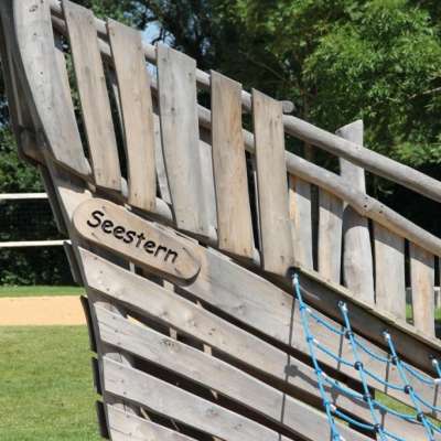 Le bateau pirate "étoile de mer" représente un navire brisé en deux, quasiment échoué, et invite à se balancer, à grimper et à glisser. La créativité, fonction clé de la vie, trouve ici son espace.