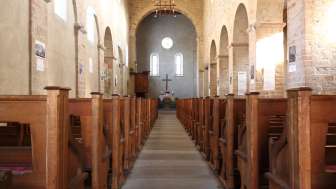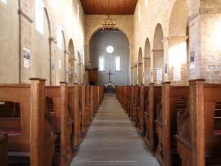 L'église est une basilique romane à trois nefs de style lombard. La nef latérale nord, délabrée par l'influence du Rhin tout proche, a été démolie vers 1600. De la peinture du 13ème siècle, il reste celle de l'arc de triomphe. Les fresques de sainte Agathe (mur nord), de saint Sébastien (chœur) et de saint Antoine et Benoît (abside latérale) ont été réalisées après 1500, les fonts baptismaux en 1512. La chaire date du 17ème siècle.