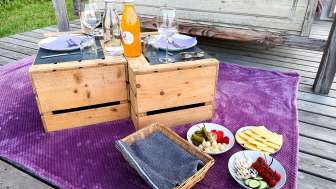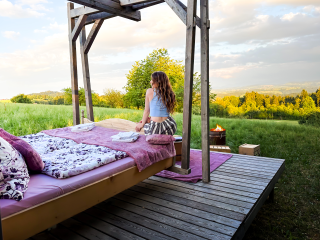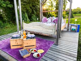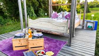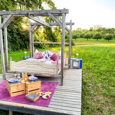 Dans un coin reculé de la Thurgovie, sur le versant du Nollen, se trouve le lit flottant thurgovien. Et flotter, c'est vraiment ce que l'on fait ici - sur un petit nuage de bien-être. Le lit double douillet, fixé à un cadre en bois, berce doucement les hôtes dans leur sommeil, à l'abri des regards, au milieu de la nature, en plein air et avec une vue magnifique sur les étendues verdoyantes de la Thurgovie. Ceux qui n'aiment pas se balancer fixent le lit. Le lit flottant se trouve sur le terrain de la ferme Wunderli à Hosenruck. En cas de mauvais temps, il est possible de déployer un toit de bâche ou de passer dans une chambre de la ferme. Un panier petit-déjeuner est inclus et peut être servi au lit sur demande. Une boisson de bienvenue attend les hôtes à leur arrivée et ceux qui le souhaitent peuvent commander en plus un panier-grill ou une raclette pour le dîner au lit flottant. Les installations sanitaires se trouvent à distance de marche.