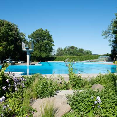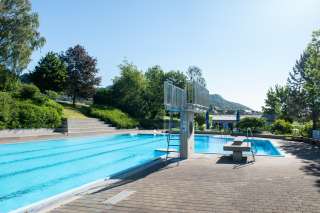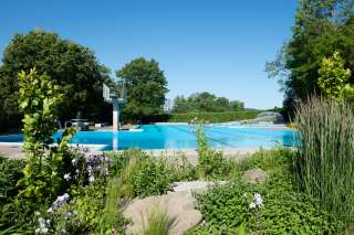 La piscine est idéalement située en bordure du village et est facilement accessible par les transports en commun. Une pataugeoire originale pour les enfants, un toboggan attrayant intégré dans le terrain naturel, un baby-foot et une table de ping-pong ainsi qu'un superbe terrain de beach-volley et une vaste surface de jeu en gazon permettent de varier les plaisirs tout en ayant une bonne vue d'ensemble.