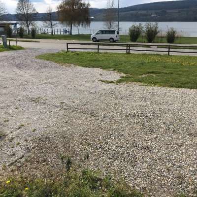 Six emplacements à l'année sont aménagés sur le parking de la piscine de Steckborn, à proximité visuelle du lac de Constance.